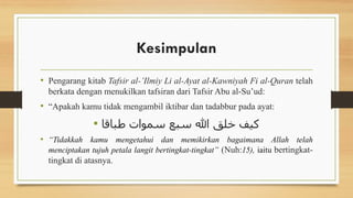 Dan Kami jadikan pelita yang amat terang matahari Surah An-Naba Ayat 13. Surat Asy-Syams ayat 1-2. Dalam tafsir ini beliau cukup memberi perhatian kepada ayat-ayat al-quran yang berkaitan dengan al-kawniyyah atau perkembangan alam tabii sebagai cara menguatkan akidah.
